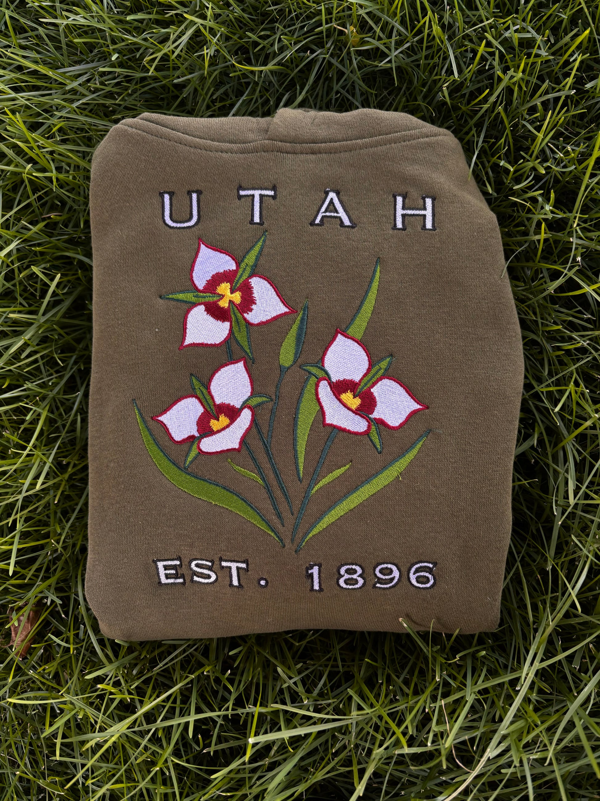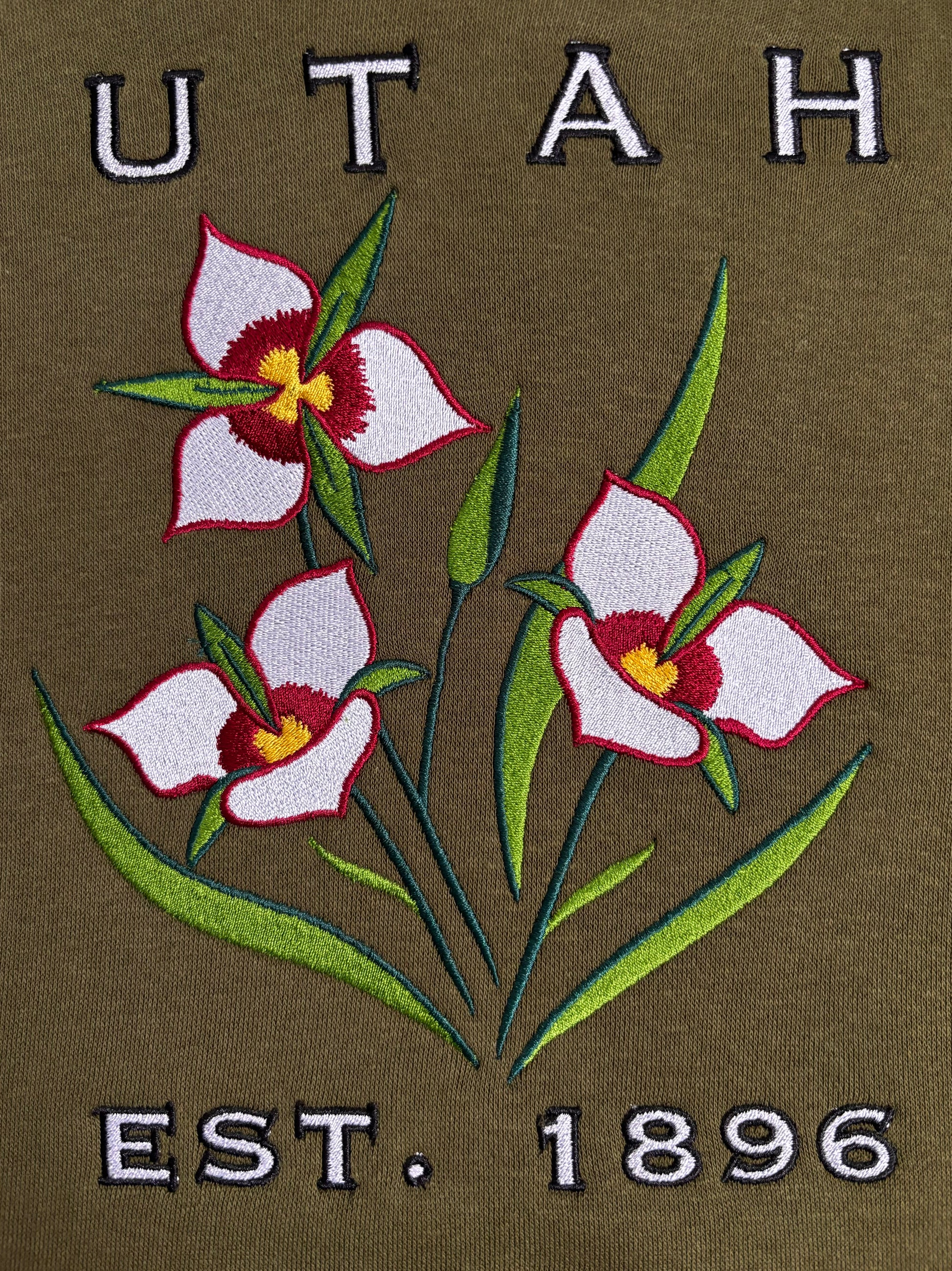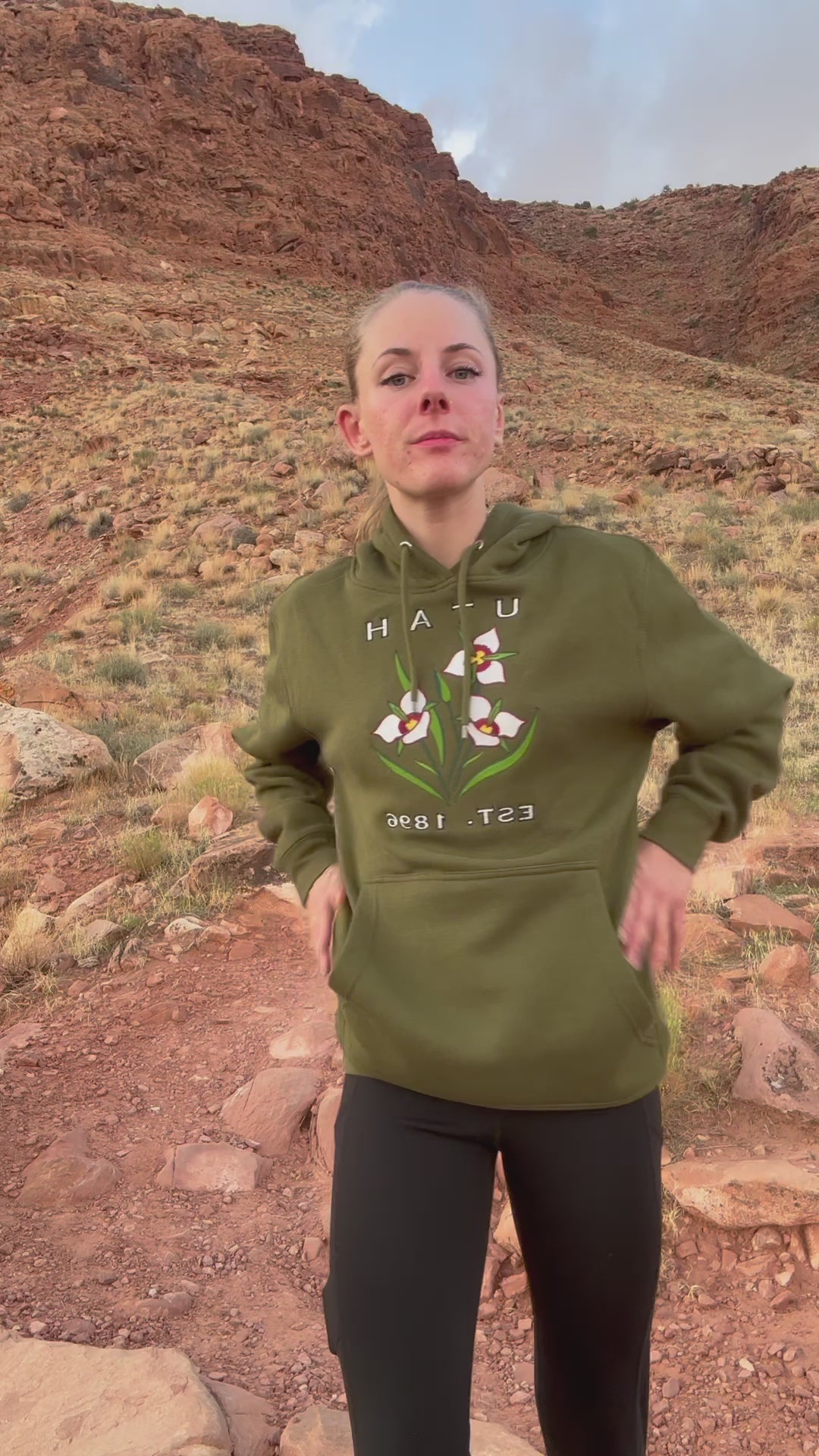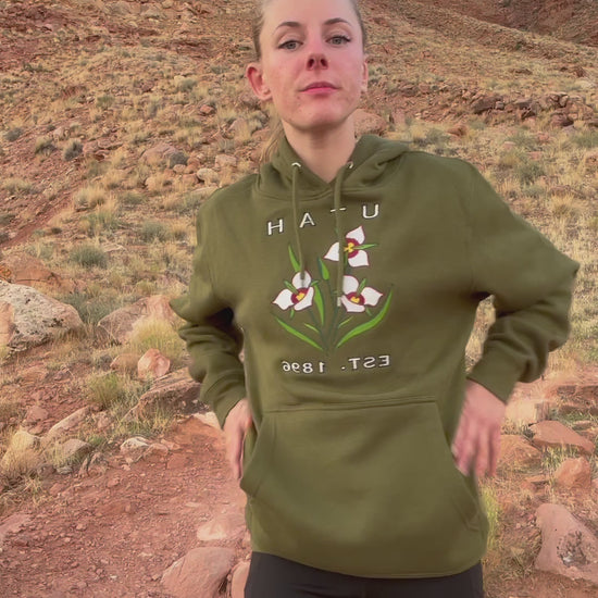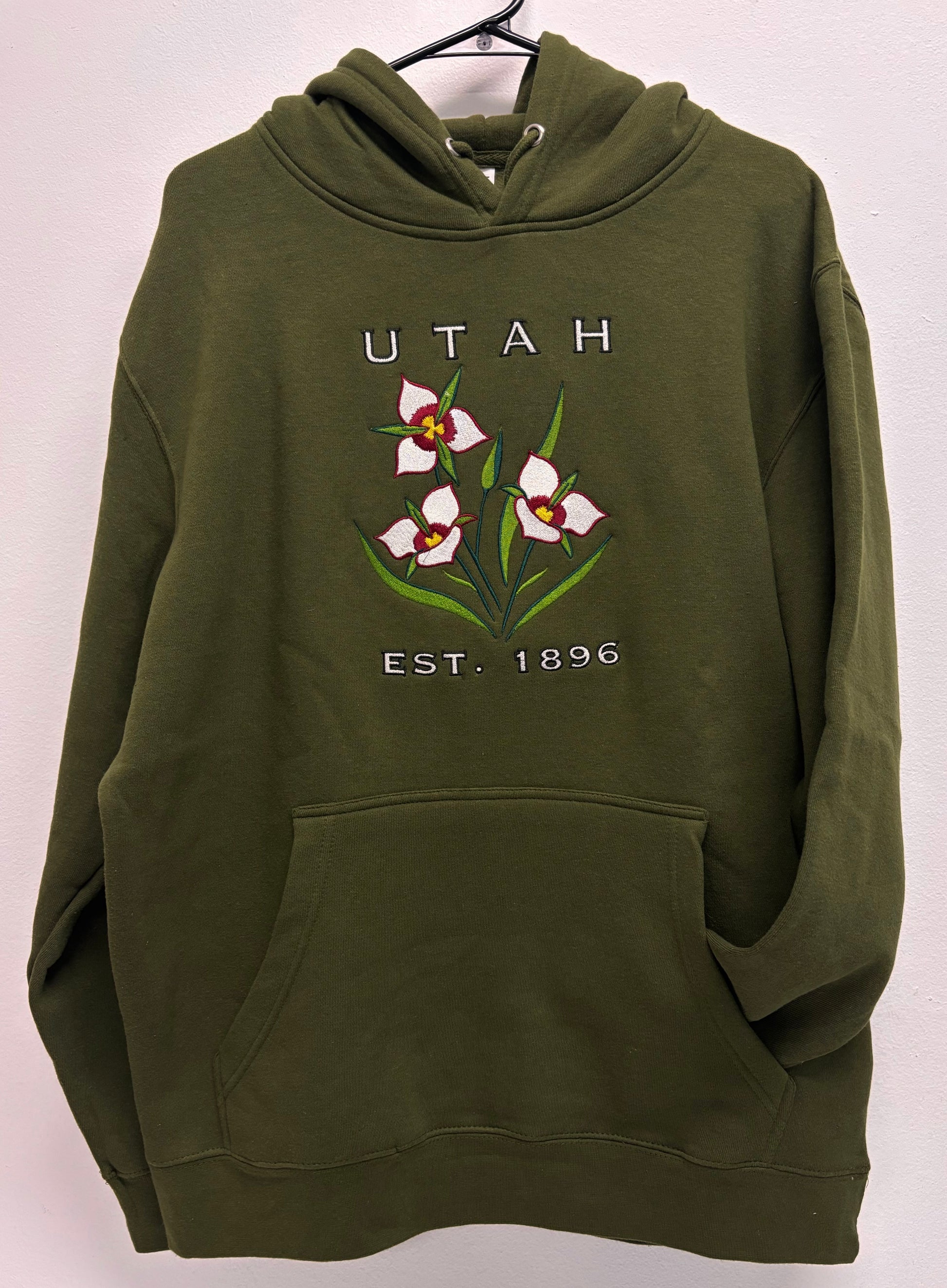 Celebrate the native flora of Utah with this state flower hoodie! The Sego Lily can be found all over the high desert of Utah and this super soft embroidered hoodie is the perfect way to show your love for this beautiful flower. Crafted with care in Utah, these sweatshirts feature a drawstring hood and large pocket, embroidery is 9 inches by 7 inches